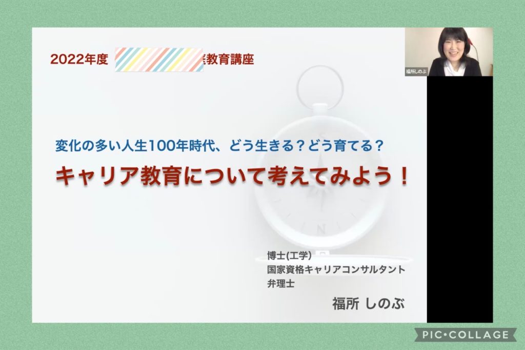 今回は、画像の通り『変化の多い人生100年時代、どう生きる?どう育てる? キャリア教育について考えてみよう!』というテーマでお話しました。